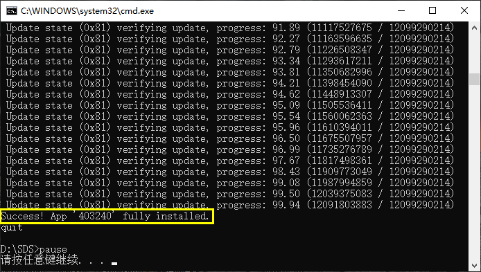 Success! App '403240' fully installed.(图中框选内容),那么 Squad 服务端就已正确安装在了服务器上。